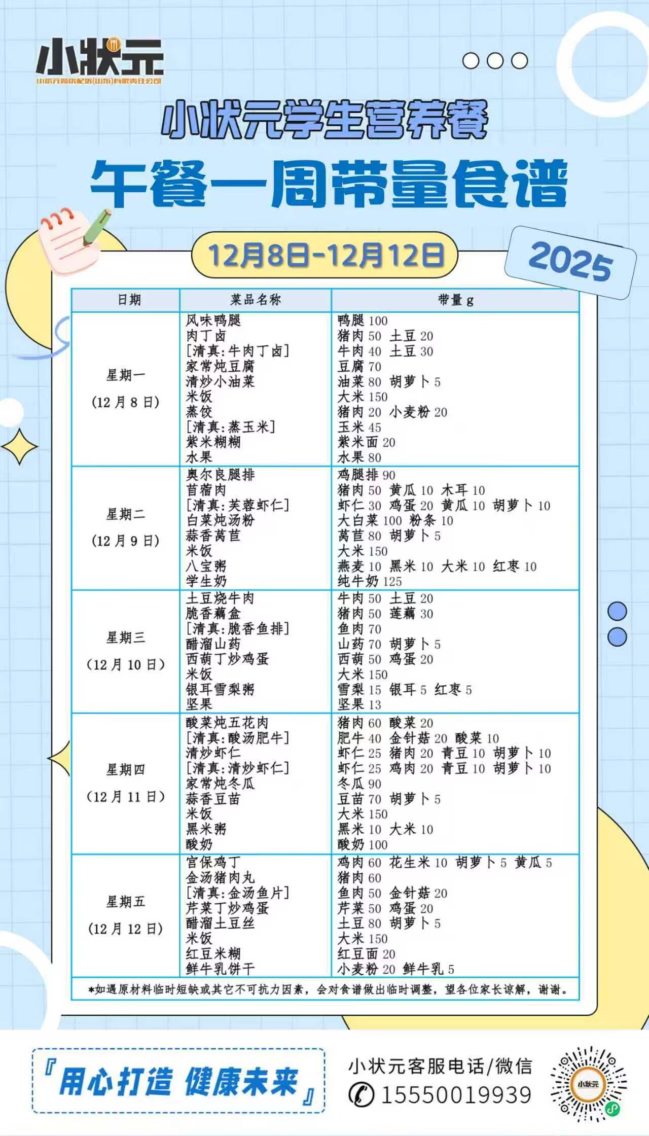 山东省济南第三十四中学2025-2026学年第一学期第十五周配餐公示