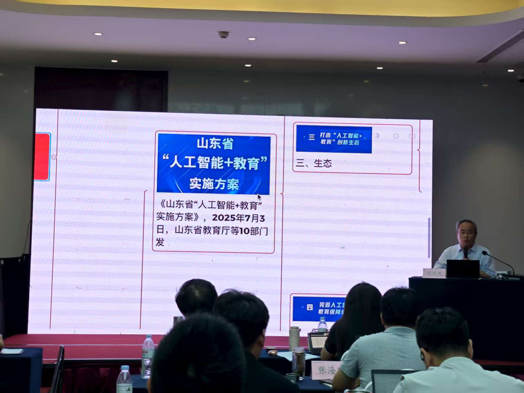 培训中,谢校长指出,当前“人工智能+教育”已成为教育领域工作重点。在国家教育层面,《中国智慧教育白皮书》中明确2025年为智慧教育元年,教育部亦将“提升数智赋能水平”纳入重点任务。在地方教育层面,山东省提出《山东省“人工智能+教育”实施方案》,济南市教育局2025年暑期工作会议也提出“构建以数字化为支撑、多元主体参与的个性化评价机制”。谢校长对政策的解读与总结为学校推进教育信息化提供政策遵循。