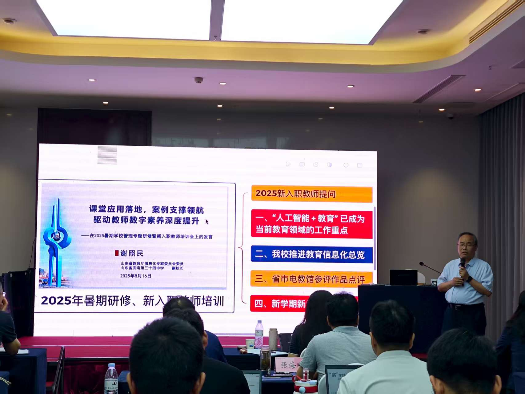2025年8月16日上午,山东省济南第三十四中学2025年暑期学校管理工作专题研修暨新入职教师培训会继续进行,学校管理团队、2025年新入职教师参加本次会议。会议上,谢照民副校长围绕教育信息化工作开展题为“课堂应用落地,案例支撑领航——驱动教师数字素养深度提升”的专题培训,推动“人工智能+教育”深度融入教学实践,助力新入职教师快速提升数字素养,为教师们明晰方向、凝聚力量。